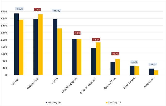 Σε κλαδικό επίπεδο, τα τρόφιμα και τα χημικά παρέμειναν ο κινητήριος μοχλός υποστήριξης των ελληνικών εξαγωγών καταγράφοντας ανοδική τάση στο σύνολο του οκταμήνου. Οι εξαγωγές τροφίμων αυξήθηκαν κατά €352,4 εκατ., δηλαδή 11,2%, ενώ των χημικών προϊόντων κατά €522,0, δηλαδή 19,7%. Θετική ήταν και η πορεία των εξαγωγών ποτών και καπνών (€32,9 εκατ., δηλαδή 6,6%) και λιπών και ελαίων (€100,8 εκατ., δηλαδή 38,0%). Αντίθετα, τα πετρελαιοειδή μειώθηκαν κατά €2.585,9 εκατ., δηλαδή 40,1%, τα βιομηχανικά κατά €268,4 εκατ., δηλαδή 7,8%, τα μηχανήματα και οχήματα κατά €1,5 εκατ., δηλαδή 0,1%, τα διάφορα βιομηχανικά κατά €305,5 εκατ., δηλαδή 16,5%, οι πρώτες ύλες κατά €170,6 εκατ., δηλαδή 18,7% και τα μη ταξινομημένα αγαθά κατά €32,4 εκατ., δηλαδή 9,7%.