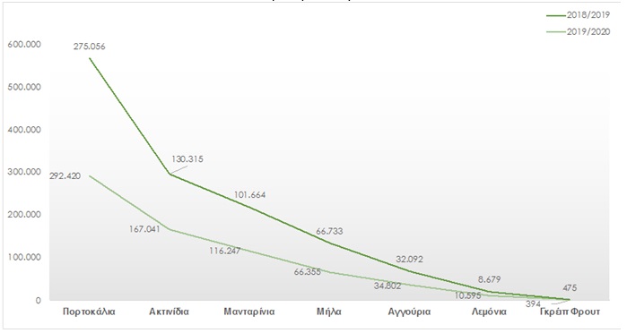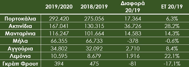 Οι εξαγωγές ακτινιδίων παρουσίασαν τη μεγαλύτερη ενίσχυση στο διάστημα Σεπτέμβριος 2019-Απρίλιος 2020, καθώς αυξήθηκαν κατά 36.726 τόνους, δηλαδή 28,2% με αποτέλεσμα να διαμορφωθούν στους 167.041 τόνους την τρέχουσα περίοδο, με τις Ισπανία και Ιταλία να αποτελούν τους σημαντικότερους προορισμούς σε ποσοστό 16,7% και 15,2% αντίστοιχα. Κατά 14,5%, δηλαδή κατά 14.583 τόνους, αυξήθηκαν και οι εξαγωγές μανταρινιών το φετινό διάστημα Οκτώβριος 2019-Απρίλιος 2020 έναντι του περσινού, με αποτέλεσμα να διαμορφωθούν σε 116.247 τόνους. Όπως παρουσιάζεται και στον Πίνακα 1, οι εξαγωγές μήλων σημείωσαν μικρή μείωση κατά 378 τόνους, δηλαδή 0,6%, οι εξαγωγές αγγουριών αυξήθηκαν κατά 2.710 τόνους, δηλαδή 8,4%, όπως και οι εξαγωγές λεμονιών κατά 1.916 τόνους, ενώ αντίθετα οι εξαγωγές γκρέιπ φρουτ μειώθηκαν κατά 81 τόνους, δηλαδή 17,1%.