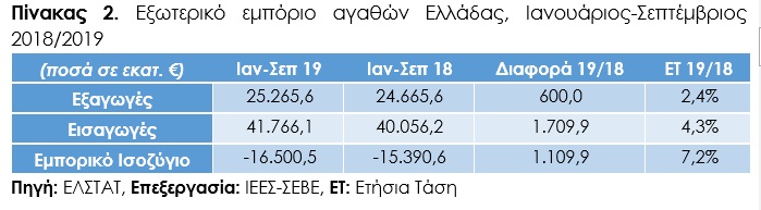 Σύμφωνα με τα διαθέσιμα στοιχεία της ΕΛΣΤΑΤ, στο διάστημα Ιανουάριος-Σεπτέμβριος 2019 οι εξαγωγές της Ελλάδας συνέχισαν την ανοδική τους πορεία με αποτέλεσμα να διαμορφωθούν στο ποσό των €25.265,6 εκατ., με τη διαφορά συγκριτικά με το αντίστοιχο διάστημα του προηγούμενου έτους να ανέρχεται σε €600,0 εκατ., δηλαδή 2,4%. Παρά την ενίσχυση των ελληνικών εξαγωγών, το εμπορικό μας ισοζύγιο παραμένει ελλειμματικό κατά €16.500,5 εκατ., σημειώνοντας αύξηση κατά €1.109,9 εκατ., δηλαδή 7,2% συγκριτικά με το 9μηνο 2018, καθώς οι εισαγωγές που πραγματοποίησε η χώρα ενισχύθηκαν σημαντικά και διαμορφώθηκαν στο ποσό των €41.766,1 εκατ., αυξημένες κατά €1.709,9 εκατ., δηλαδή 4,3%.