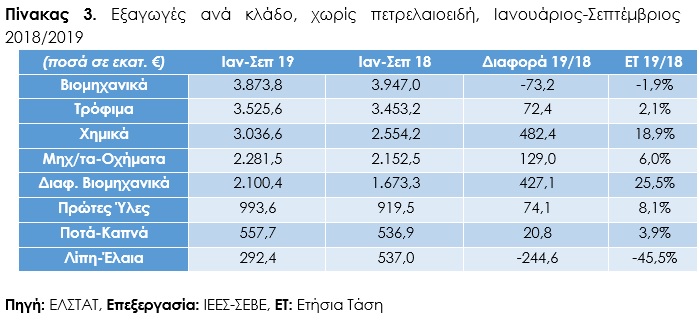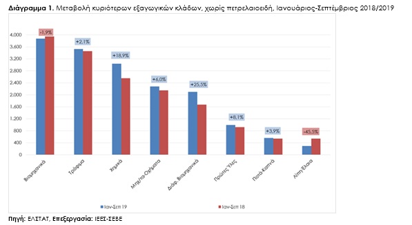 Σημαντική άνοδο κατέγραψαν οι ελληνικές εξαγωγές στο 9μηνο 2019, όπως προκύπτει από τα προσωρινά στοιχεία που δημοσίευσε σήμερα 07.11.2019 η Ελληνική Στατιστική Αρχή και επεξεργάστηκε το Ινστιτούτο Εξαγωγικών Ερευνών και Σπουδών (ΙΕΕΣ) του ΣΕΒΕ.