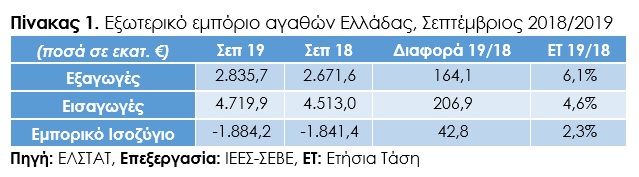Συγκεκριμένα, το Σεπτέμβριο 2019 οι ελληνικές εξαγωγές διαμορφώθηκαν σε €2.835,7 εκατ. έναντι €2.671,6 το Σεπτέμβριο 2018, με την αύξηση να διαμορφώνεται σε €164,1 εκατ., δηλαδή 6,1%. Αντίστοιχα, ανοδική ήταν και η πορεία των ελληνικών εισαγωγών, οι οποίες αυξήθηκαν κατά €206,9 εκατ., δηλαδή 4,6% και ανήλθαν σε €4.719,9 εκατ., διαμορφώνοντας έλλειμμα στο εμπορικό ισοζύγιο της χώρας το οποίο ανήλθε σε €1.884,2 εκατ. το Σεπτέμβριο 2019, αυξημένο κατά €42,8 εκατ., δηλαδή 2,3% σε σχέση με τον αντίστοιχο μήνα του 2018, όπως παρουσιάζεται στον Πίνακα 1.