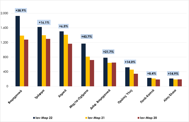 Γράφημα 1. Μεταβολή κυριότερων κλάδων (2020/2021), χωρίς πετρελαιοειδή, Ιανουάριος-Μάρτιος 2022/2021/2020