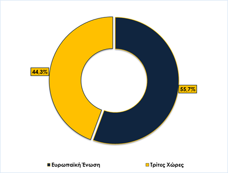 Αναφορικά με τους σημαντικότερους προορισμούς όπου απεστάλησαν τα ελληνικά προϊόντα στο α’ τρίμηνο του 2022, οι χώρες της Ε.Ε. (27) κυριάρχησαν απορροφώντας το 55,7% και το 66,9% χωρίς τα πετρελαιοειδή, ενώ οι Τρίτες Χώρες υποδέχτηκαν το 44,3% εξ αυτών και το 33,1% χωρίς τα πετρελαιοειδή. Στο αντίστοιχο διάστημα του 2021 τα ποσοστά ήταν 54,1% για τις χώρες της Ε.Ε. (27) και 45,9% για τις Τρίτες Χώρες συμπεριλαμβανομένων πετρελαιοειδών.