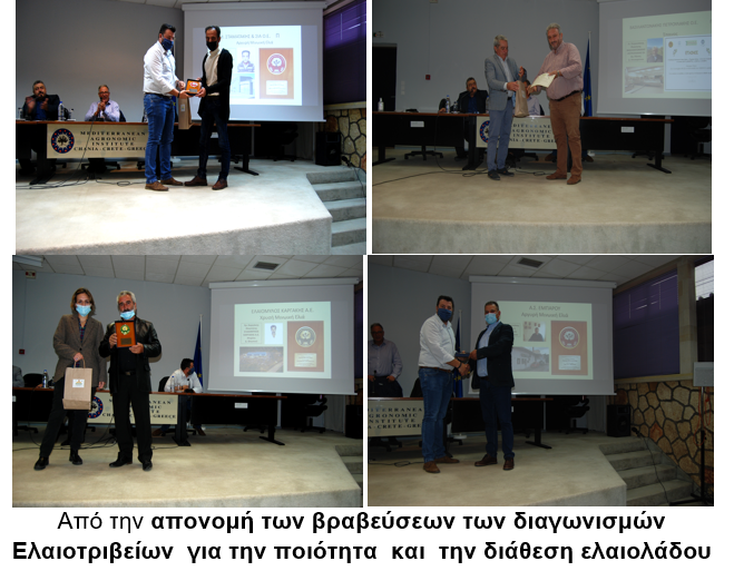 Στα πλαίσια της ημερίδας έγινε και η απονομή των Βραβεύσεων Ελαιοτριβείων που συμμετείχαν στους διαγωνισμούς Ποιότητας και Εμπορίας ελαιολάδου 2020/21 που είχε προκηρύξει ΣΕΔΗΚ κατά την οποια επιβραβεύτηκαν με πλακέτες της Χρυσής , Αργυρής και Χάλκινης Μινωικής Ελιάς και Επαίνους