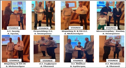 ΕΠΑΙΝΟΙ απονεμήθηκαν στα ελαιοτριβεία: Α.Σ. Ζυμβραγού, Α.Σ. Μαλλών (Δ. Ιεράπετρας), Παπαμαστοράκη Αδάμ( Δ. Βιάννου), Βασιλαντωνάκη-Πετρουλάκη ( Δ. Αποκορώνου), Παρασχάκης Ε. ( Μυλοποτάμου),