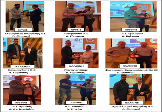 ΧΡΥΣΕΣ απονεμήθηκαν στα ελαιοτριβεία: Αστερούσια ΑΕ ( Δ, Γόρτυνας), Α.Σ. Σταβιών ( Δ. Γόρτυνας), Ελαιόμυλος Καργάκης ΑΕ,( Δ. Φαίστου).