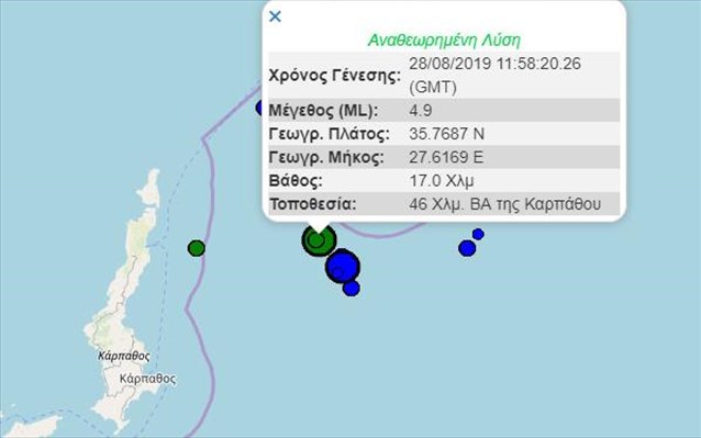 Σύμφωνα με το Γεωδυναμικό Ινστιτούτο του Εθνικού Αστεροσκοπείου Αθηνών, ο σεισμός είχε επίκεντρο στον θαλάσσιο χώρο 46 χλμ βορειοανατολικά της Καρπάθου.