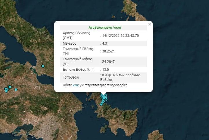 Ειδικότερα, σύμφωνα με το Γεωδυναμικό Ινστιτούτο του Εθνικού Αστεροσκοπείου Αθηνών, η σεισμική δόνηση ήταν μεγέθους 4,3 βαθμών της κλίμακας Ρίχτερ και σημειώθηκε 8 χιλιόμετρα νοτιοανατολικά των Ζαράκων Ευβοίας. Ο Σεισμός είχε εστιακό βάθος 13,5 χιλιόμετρα.