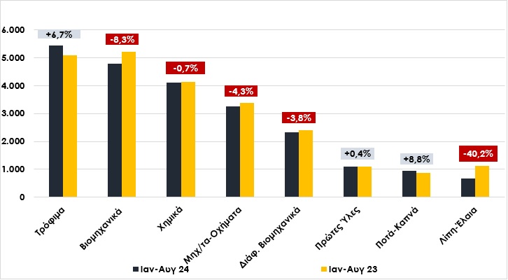 Γράφημα 1. Μεταβολή κυριότερων κλάδων, χωρίς πετρελαιοειδή, Ιανουάριος-Αύγουστος 2023/2024
