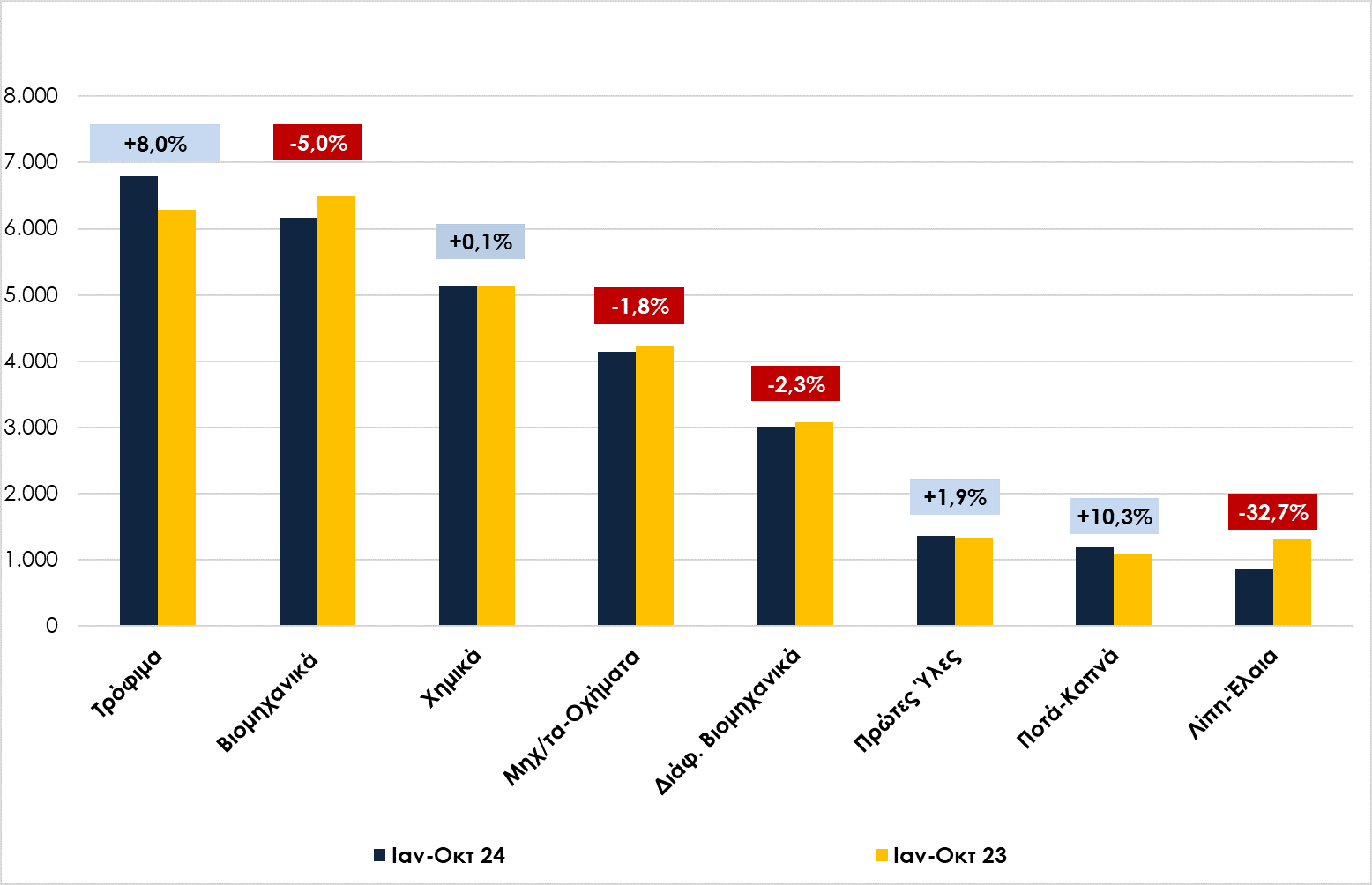 Σε κλαδικό επίπεδο, ο κλάδος των τροφίμων σημείωσε τη μεγαλύτερη αύξηση σε απόλυτες τιμές, με άνοδο €505,4 εκατ. (+8,0%), ενώ τα ποτά-καπνά κατέγραψαν τη μεγαλύτερη ποσοστιαία αύξηση, με €111,5 εκατ. (+10,3%). Σταθερότητα παρουσίασαν οι κλάδοι των χημικών (€7 εκατ., +0,1%) και των πρώτων υλών (+€25,1 εκατ., +1,9%), ενώ τα βιομηχανικά αγαθά υποχώρησαν κατά €326,5 εκατ. (-5,0%) και τα μηχανήματα-οχήματα κατά €77,9 εκατ. (-1,8%). Σημαντική μείωση παρατηρήθηκε και στα λίπη-έλαια, με πτώση €426,6 εκατ. (-32,7%), ενώ τα διάφορα βιομηχανικά προϊόντα σημείωσαν μείωση €71,1 εκατ. (-2,3%).Ο κλάδος των πετρελαιοειδών είχε την πιο σημαντική αρνητική συμβολή στη συνολική εικόνα, με μείωση €1,197,5 εκατ. (-8,6%) συγκριτικά με το 2023, επηρεάζοντας καθοριστικά το σύνολο των εξαγωγών. Η πτώση αυτή αντανακλά είτε μειωμένες διεθνείς τιμές είτε μειωμένη ζήτηση για τα ελληνικά πετρελαιοειδή, γεγονός που συνέβαλε στη συνολική μείωση των εξαγωγών κατά €1,102,8 εκατ. (-2,6%).