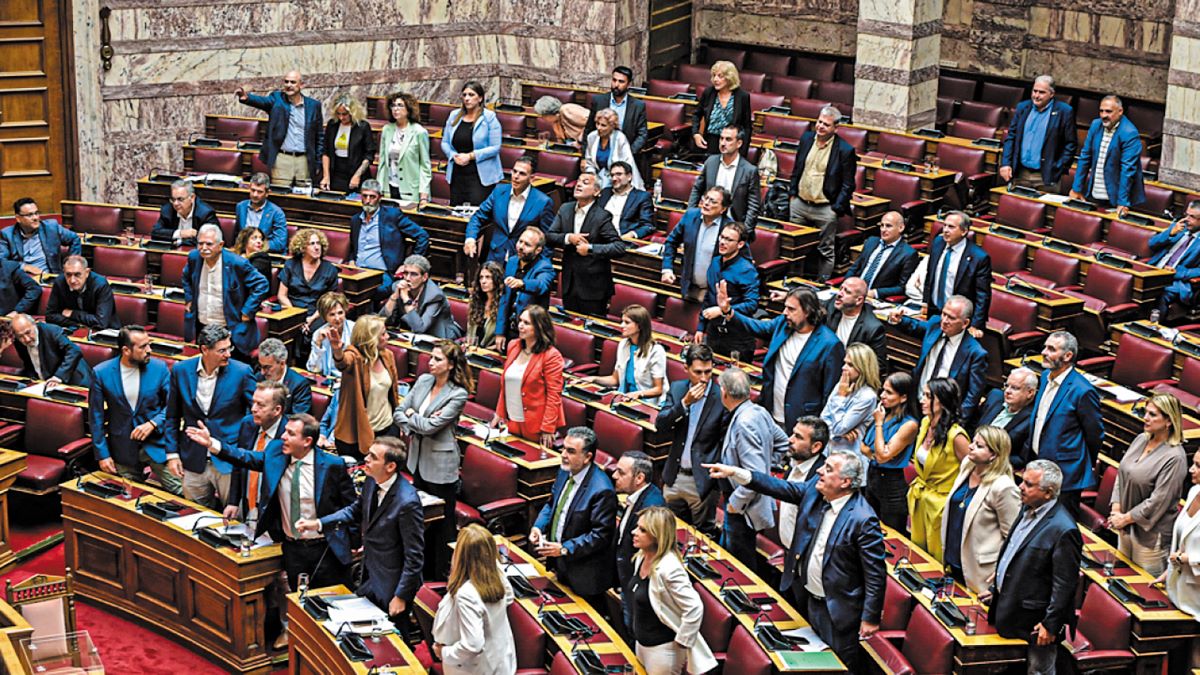Νωρίτερα, σε περιβάλλον χαώδους οξύτητας, αποχωρούσε σύσσωμη η αντιπολίτευση εγείροντας ζήτημα ακυρότητας, λόγω της ολιγάριθμης φυσικής παρουσίας «γαλάζιων» στην Ολομέλεια. Ειδικότερα, η αντιπολίτευση ήγειρε ένσταση αντικανονικότητας της διαδικασίας εξαιτίας της μαζικής απουσίας βουλευτών της ΝΔ λίγο πριν από τη στιγμή έναρξης της ονομαστικής ψηφοφορίας.