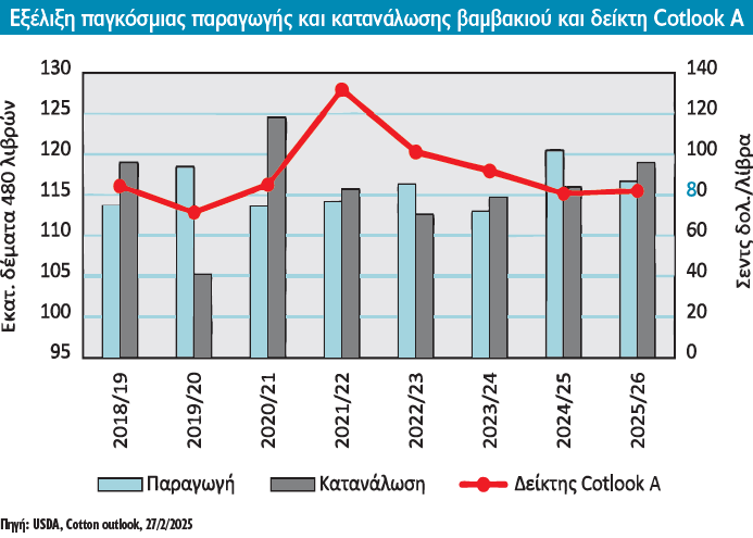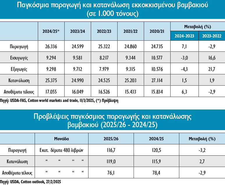Όπως προκύπτει από ορισμένες πρόσφατες εκτιμήσεις (στοιχεία USDA, Cotton outlook, 27/2/2025), αν και πρόωρες, η παγκόσμια παραγωγή εκκοκκισμένου βαμβακιού προβλέπεται την περίοδο 2025/2026 να περιοριστεί σε 116,7 εκατ. δέματα, παρουσιάζοντας σημαντική μείωση ως προς την προηγούμενη (-3,2%). Αντίθετα, αισθητή άνοδος αναμένεται στην παγκόσμια κατανάλωση, ο όγκος της οποίας προβλέπεται να ανέλθει σε 119 εκατ. δέματα (+2,7%).