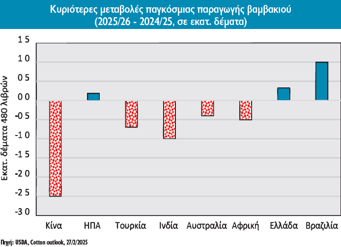 Η προβλεπόμενη πτώση της παγκόσμιας παραγωγής θα προέλθει, κυρίως, από τη σημαντική μείωσή της στην Κίνα, ο όγκος της οποίας, ως συνέπεια του περιορισμού των αποδόσεων, αναμένεται την περίοδο 2025/2026 να περιοριστεί σε 28,5 εκατ. δέματα, μειωμένος κατά 2,5 εκατ. δέματα από την προηγούμενη (-8,1%).