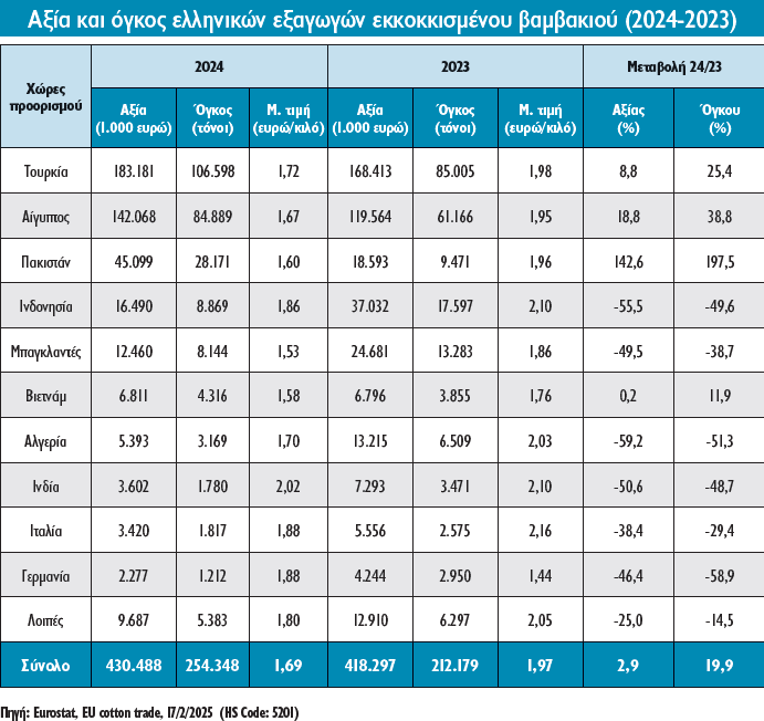 Σε ετήσια βάση, οι ελληνικές εξαγωγές εκκοκκισμένου βαμβακιού ανήλθαν σε 254 χιλ. τόνους το 2024, αξίας 430 εκατ. ευρώ, παρουσιάζοντας, σε σύγκριση με το προηγούμενο έτος, σημαντική αύξηση στον όγκο (+20%), αλλά πολύ μικρότερη στην αξία (+2,9%)