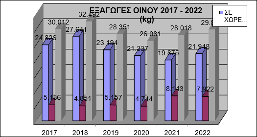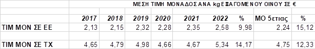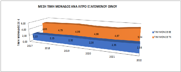 Τέλος αξιοσημείωτα αυξητική καταγράφεται η εξέλιξη της μέσης τιμής μονάδος, ανά εξαγόμενο κιλό οίνου. Το 2022 παρουσιάζει αύξηση κατά 14,17% (4,67 €/kg/2021 – 5,34 €/kg/2022), ενώ η αυξητική τάση της μέσης τιμής μονάδος καταγράφεται σε σχέση και με την προηγούμενη 5ετία που ανέρχεται σε 12,33% (Μέσος Όρος τιμής 5ετίας 4,75 €/kg).