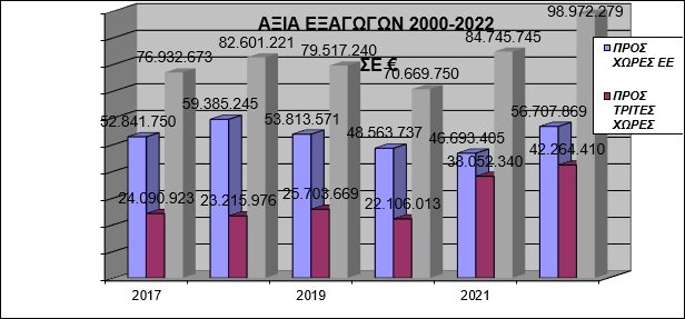 Σε επίπεδο αξίας τα μεγέθη κινούνται με σημαντικά θετικό ρυθμό επιδόσεων, αφού παρατηρείται αύξηση των εξαγωγών σε αξία προς Τρίτες Χώρες που ανέρχεται σε ποσοστό 11,07% (38.052.340 €/2021 – 42.264.410 €/2022).