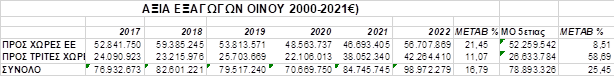 Σε αξία οι ελληνικές αποστολές οίνων προς χώρες της Ε.Ε. το 2022 παρουσιάζουν αξιοσημείωτη αύξηση της τάξης του 21,45% (46.893.405 € /2021 – 56.707.869 €/2022), όπως επίσης παρουσιάζουν αύξηση της τάξης του 8,17% σε σχέση με το μέσο όρο της προηγούμενης 5ετίας.