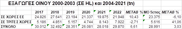 Η εικόνα των αντίστοιχων μεγεθών εξαγωγών ελληνικού οίνου προς Τρίτες χώρες είναι ικανοποιητική σε αξία, λαμβανομένου όμως υπ’ όψιν ότι το έτος 2021 τα προβλήματα logistics στην μεγαλύτερη αγορά, αυτή των ΗΠΑ που προήλθαν από την εκδήλωση της πανδημίας της covid 19, δεν είχαν αποκατασταθεί τότε.