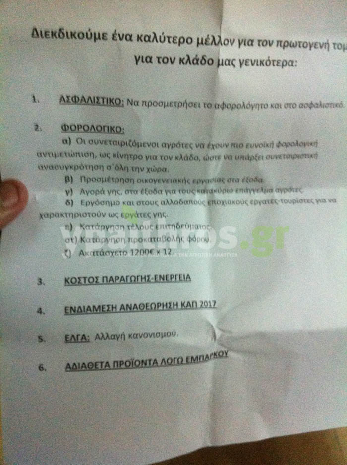 Επίσης χαρακτηρίζουν αντιπαραγωγικό το καθεστώς που έχει διαμορφωθεί με το κόστος παραγωγής στη χώρα, ενώ τονίζουν πως πρέπει να προστατευτούν η ζωική και φυτική παραγωγή «διότι πάνω σ’ αυτές βασίζεται η διαμόρφωση της οικονομικής ευημερίας μιας χώρας».