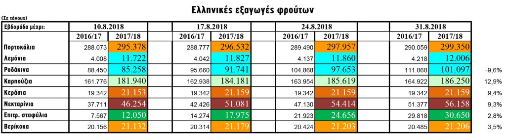 Στο μεταξύ, με αύξηση κατά 4,7% σε σύγκριση με την αντίστοιχη περσινή περίοδο συνεχίστηκαν οι εξαγωγές ανοιξιάτικων-καλοκαιρινών φρούτων, με τις ροές για τα ροδάκινα και τα νεκταρίνια σε κανονικά για την εποχή επίπεδα, με μικρή, όπως εκτιμάται, επίπτωση από την απαγόρευση της εισαγωγής πυρηνόκαρπων φρούτων της Ρωσίας από Σερβία και ΠΓΔΜ.