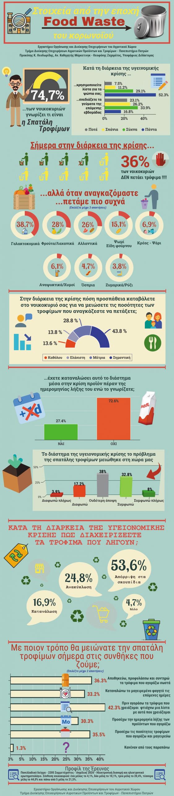 Σύμφωνα με την έρευνα, ποσοστό 72,6% των ερωτηθέντων δήλωσε πως το πρόβλημα της σπατάλης των τροφίμων δεν μειώθηκε κατά τη διάρκεια της καραντίνας. Το 36% των ερωτηθέντων δήλωσε πως δεν πετάει τρόφιμα και το 52,3% πως πάντα ψωνίζει με λίστα αγορών, ενώ ένα ποσοστό της τάξεως του 29,1% δηλώνει πως σχεδιάζει τα γεύματα της επόμενης εβδομάδας (συχνά το 33,9% και πάντα το 16,8%). Αξιοσημείωτο είναι το γεγονός ότι το 43,8% κατέβαλε προσπάθειες να μειώσει τις ποσότητες τροφίμων που αναγκάζεται να πετάει.