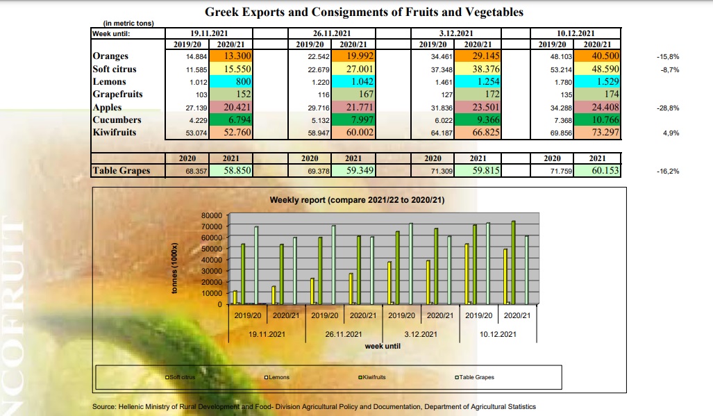 Από 1/9/2021 έως και 10/12/2021 οι αναγγελίες φορτίων καταχωρήθηκαν στο ΜΕΝΟ για εξαγωγή-διακίνηση ακτινιδίων ,που αφορούσαν 73.297 τόνους εκ των οποίων προς Ιταλία 32.970 τ. ήτοι το 45% των εξαγωγών τους