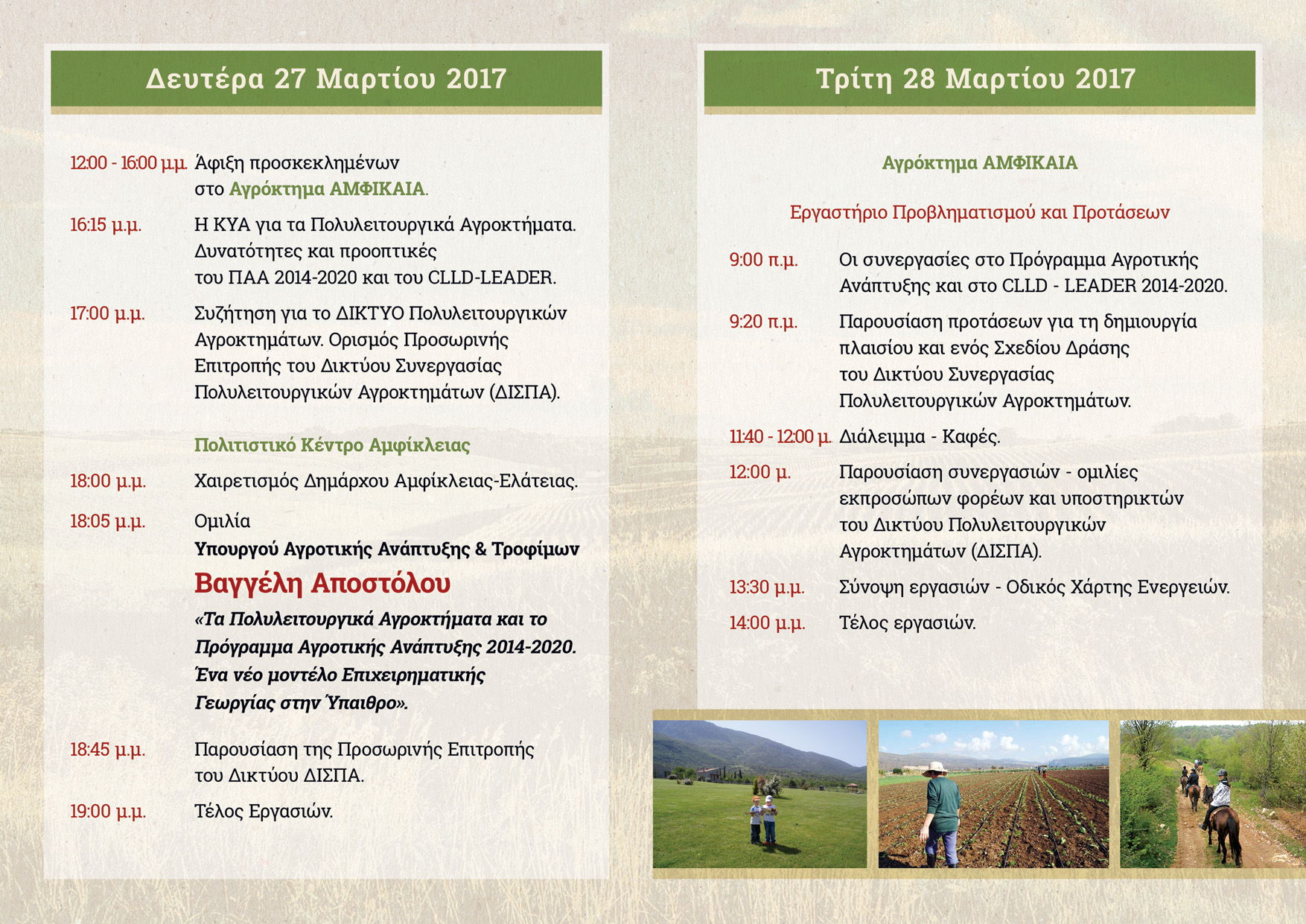 Την έναρξη των εργασιών του διήμερου Συνεδρίου για το Δίκτυο Πολυλειτουργικών Αγροκτημάτων που θα πραγματοποιηθεί στην Αμφίκλεια (Πολιτιστικό Κέντρο Αμφίκλειας, 27 & 28 Μαρτίου) θα κηρύξει την Δευτέρα 27 Μαρτίου, στις 6.00 το απόγευμα, ο υπουργός Αγροτικής Ανάπτυξης και Τροφίμων Βαγγέλης Αποστόλου.