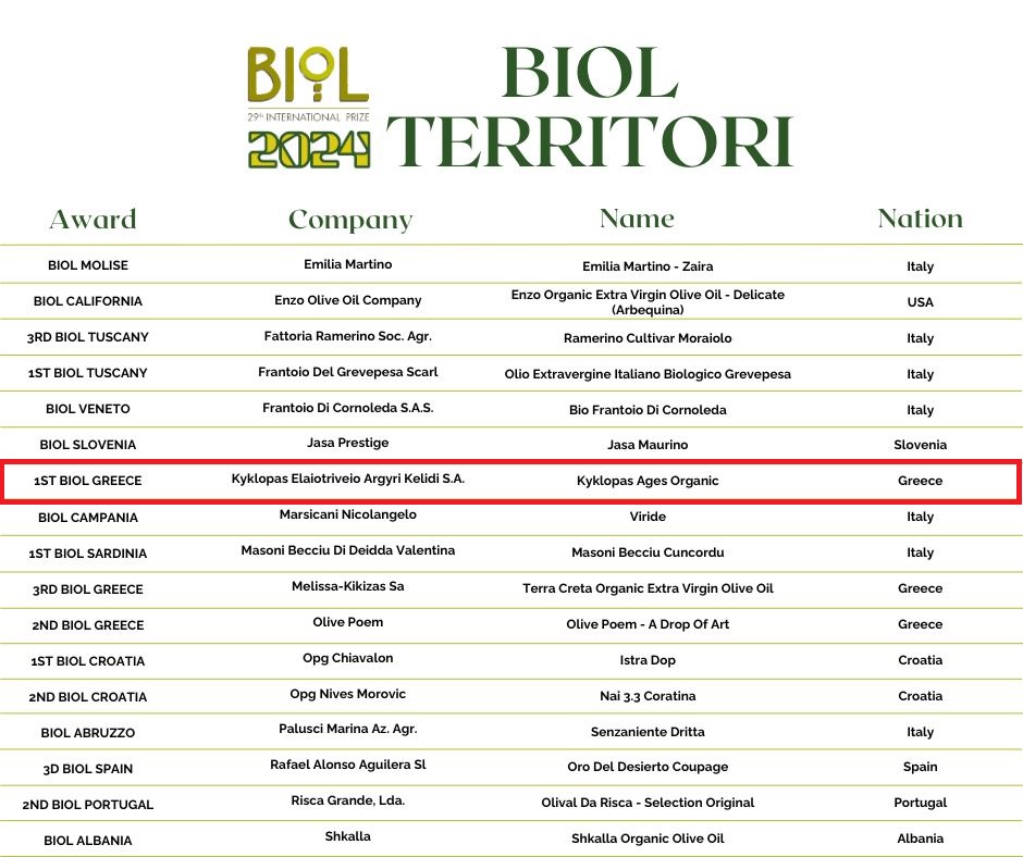 Το Αges βιολογικό εξαιρετικό παρθένο ελαιόλαδο Κύκλωπας από τη Μάκρη Έβρου κέρδισε τον τίτλο του καλύτερου ελληνικού βιολογικού ελαιολάδου στον μεγαλύτερο παγκόσμιο διαγωνισμό βιολογικών ελαιολάδων, τον BIOL, που λαμβάνει χώρα στην Ιταλία κάθε χρόνο.