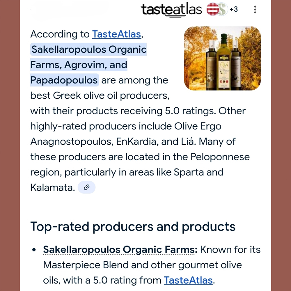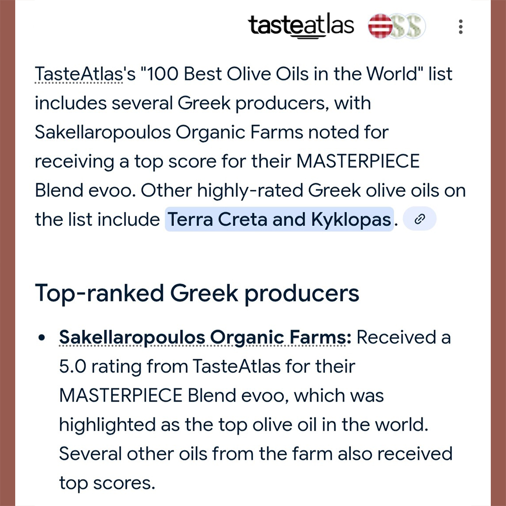 Η πρόσφατη ανακοίνωση στις λίστες και στις κορυφαίες θέσεις, με εξαιρετικά υψηλά rates, του φημισμένου γαστρονομικού οδηγού Taste Atlas, αποτελεί τιμή για τους βιολογικούς ελαιώνες Σακελλαρόπουλου».