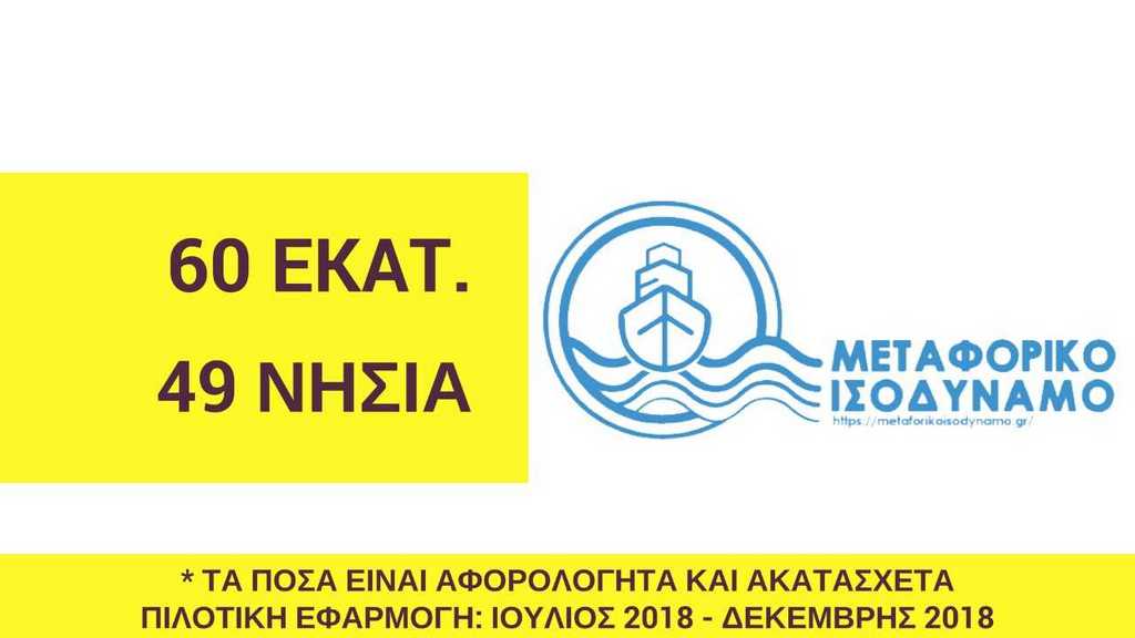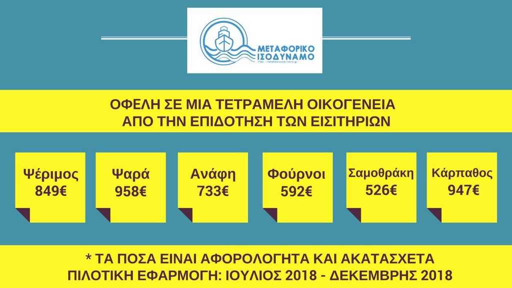 Επίσης, πρώτη φορά θα τυγχάνουν αυτής της ιδιαίτερης νησιωτικής πολιτικής, τα νησιά του Αργοσαρωνικού και του Ιονίου, που είχαν εξαιρεθεί από όλες τις άλλες πολιτικές για τα νησιά. Το όφελος του Μεταφορικού Ισοδύναμου με κοστολογημένα παραδείγματα, για το τελευταίο και μόνο εξάμηνο του 2018: