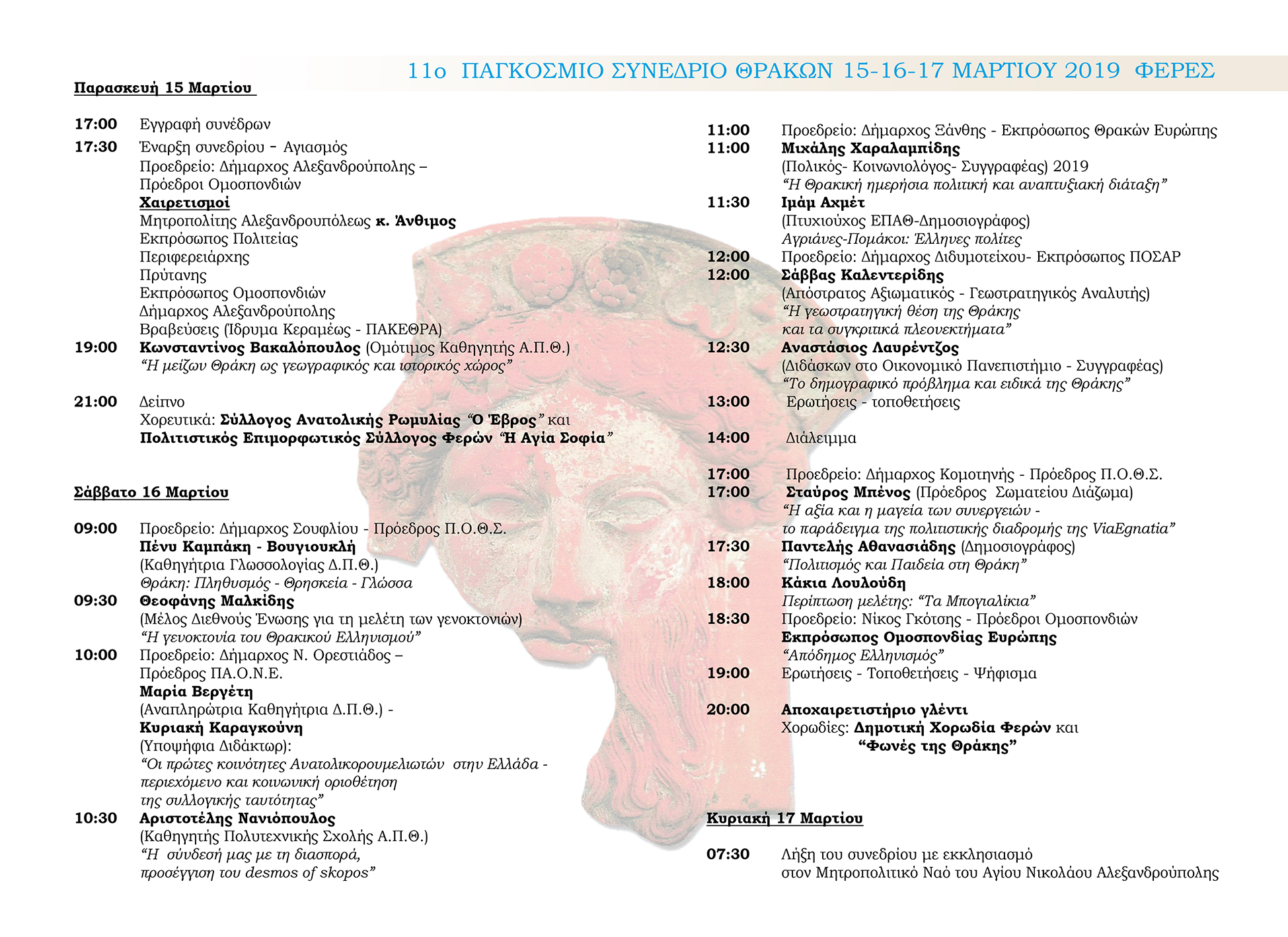 «Φέρες Ιστορία και Πολιτισμός» θα είναι π τίτλος του 11ου Παγκόσμιου Συνεδρίου Θρακών που θα πραγματοποιηθεί στις Φέρες Έβρου από τις 15 έως τις 17 Μαρτίου 2019.