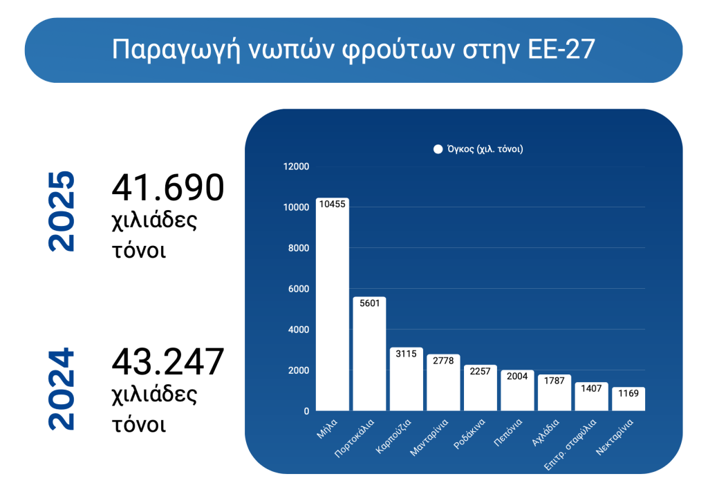 Σύμφωνα με τον απολογισμό του 2025, η συνολική παραγωγή φρούτων στις χώρες της ΕΕ-27 ανήλθε το 2025 σε 41,96 εκατομμύρια τόνους, καταγράφοντας μείωση περίπου 3% σε σχέση με το προηγούμενο έτος. Η διαφορά αυτή αντιστοιχεί σε έλλειμμα περίπου 1,3 εκατομμυρίων τόνων σε σύγκριση με το 2024. Συνολικά, οι ζημιές από παγετό σε μήλα, αχλάδια και πυρηνόκαρπα στη νοτιοανατολική Ευρώπη αντισταθμίστηκαν σε μεγάλο βαθμό από υψηλότερες αποδόσεις σε άλλα είδη φρούτων. Ενδεικτικά, η παραγωγή καρπουζιών και πεπονιών ξεπέρασε τα επίπεδα του προηγούμενου έτους σε ολόκληρη την Ευρώπη.