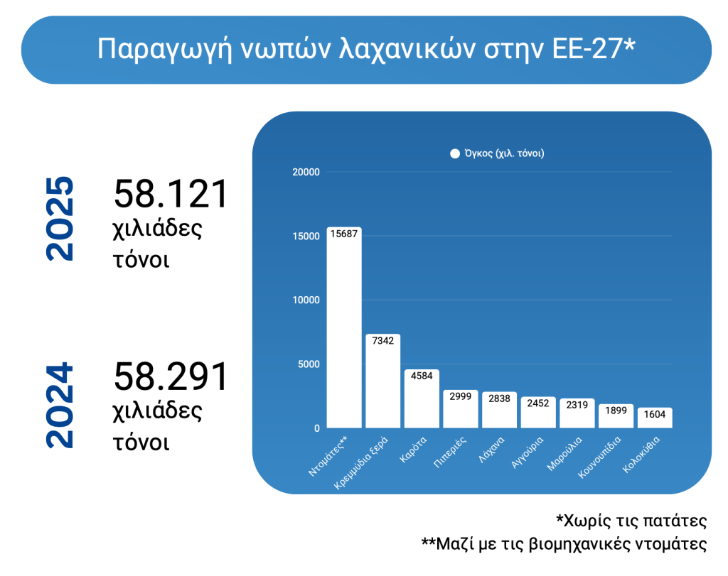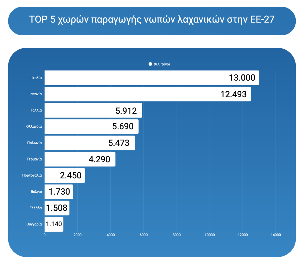 Αντίστοιχα, οι 10 μεγαλύτερες χώρες παραγωγοί νωπών λαχανικών στην ΕΕ είναι: Ιταλία με 13 εκατ. τόνους, Ισπανία με 12.493 χιλ. τόνους, Γαλλία (5.912), Ολλανδία (5.690), Πολωνία (5.473), Γερμανία (4.290), Πορτογαλία (2.450), Βέλγιο (1.730), Ελλάδα (1.508) και Ουγγαρία (1.140).