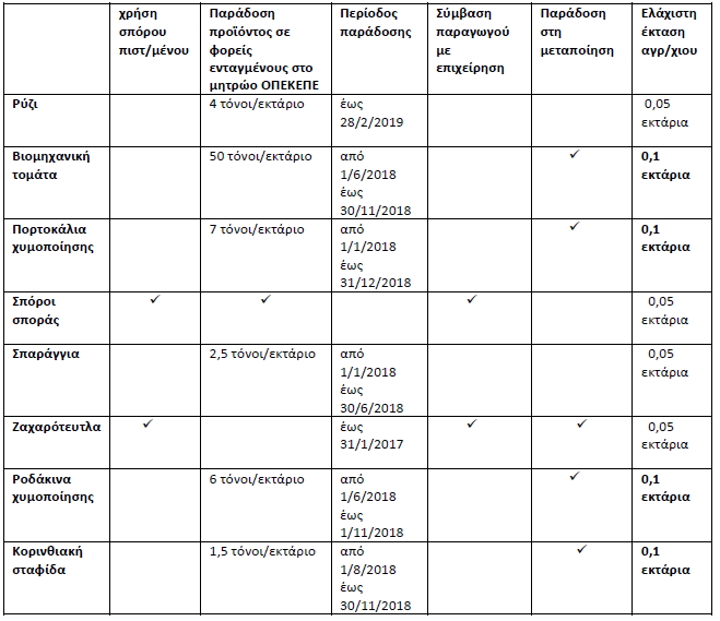 Εν όψει της υποβολής της ενιαίας αίτησης ενίσχυσης έτους 2018, επισημαίνονται στον παρακάτω πίνακα οι όροι επιλεξιμότητας για τις στρεμματικές συνδεδεμένες ενισχύσεις που έχουν ως προϋπόθεση την ελάχιστη παράδοση προϊόντος και οι κρίσιμες καταληκτικές ημερομηνίες παράδοσης.