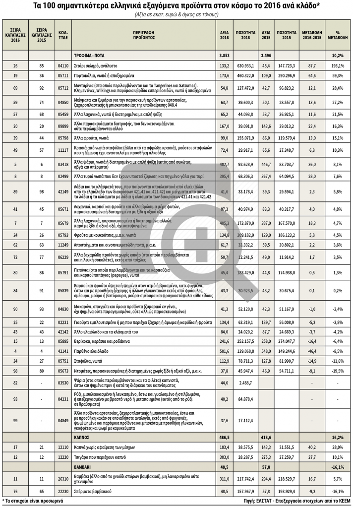 Τα 100 σημαντικότερα ελληνικά εξαγόμενα προϊόντα στον κόσμο το 2016 ανά κλάδο
