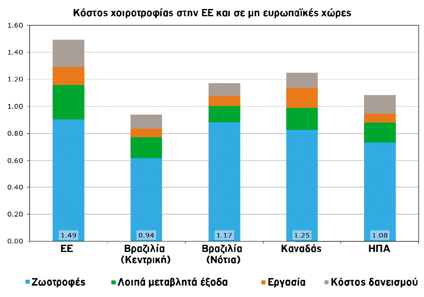 Ωστόσο, η κοστολογική αυτή υστέρηση είναι ακόμη μεγαλύτερη, αν η Ευρώπη συγκριθεί με τους υπόλοιπους παγκόσμιους παίκτες. Όπως απεικονίζεται στο σχετικό διάγραμμα, το μέσο κόστος στην ΕΕ ανέρχεται στο 1,49 ευρώ το κιλό, ενώ στις περιοχές της Βραζιλίας μεταξύ των 0,94 ευρώ έως 1,17 ευρώ, στον Καναδά 1,25 ευρώ και στις ΗΠΑ 1,08 ευρώ. Οι διαφορές αυτές οφείλονται στο κόστος ζωοτροφών, στο υψηλό κόστος δανεισμού της Ευρώπης, στο εργατικό (με εξαίρεση τον Καναδά) και, πρωτίστως, στις υψηλές απαιτήσεις της ευρωπαϊκής νομοθεσίας σε ζητήματα προστασίας του περιβάλλοντος και ευζωίας των ζώων.