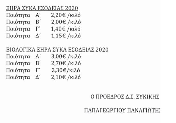 Αποφασίστηκε ομόφωνα να δοθούν αυξήσεις στις ανώτερες ποιοτικές κατατάξεις των συμβατικών σύκων και επομένως οι τιμές αγοράς ξηρών σύκων από τους συκοπαραγωγούς για το έτος 2020 διαμορφώνονται ως εξής: