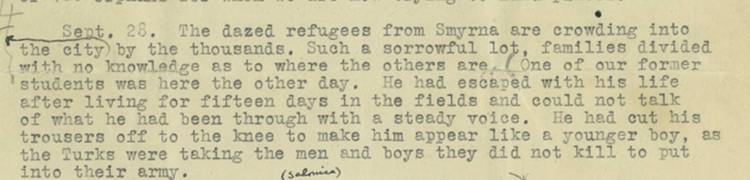 Υπογράμμισε ότι η Σχολή αποτέλεσε κύτταρο έργου αρωγής και αποκατάστασης στις πολύ δύσκολες στιγμές της προσφυγιάς. Στο Ιστορικό Αρχείο της υπάρχει πλήθος επιστολών του Charlie House, που υπήρξε ο δεύτερος διευθυντής της, οι οποίες περιγράφουν με έντονο τρόπο την άφιξη των πρώτων προσφύγων στη Θεσσαλονίκη. Οι καθημερινές του παρατηρήσεις καταγράφουν το μέγεθος του προβλήματος αλλά και την ασύλληπτη απόγνωση που είχε καταβάλει φορείς και ανθρώπους που είχαν τη διάθεση να βοηθήσουν καθώς ο αριθμός των προσφύγων διαρκώς αυξανόταν. Σε μία από αυτές τις επιστολές προς την σύζυγο του Ann Kellogg Chapman, στις 28 Σεπτεμβρίου 1922, αναφέρει: «Οι παραζαλισμένοι πρόσφυγες από τη Σμύρνη συνωθούνται στην πόλη κατά χιλιάδες. Τέτοια θλιβερή μοίρα με οικογένειες χωρισμένες και χωρίς ιδέα για το που βρίσκονται τα άλλα μέλη τους. Τις προάλλες ήταν εδώ ένας από τους μαθητές μας. Είχε σώσει τη ζωή του, αφού έζησε 14 μέρες σε ένα χωράφι. …Είχε κόψει τα παντελόνια του στο ύψος των γονάτων για να μοιάζει με μικρότερο παιδί, καθώς οι Τούρκοι έπαιρναν όσους άντρες και εφήβους δεν σκότωναν και τους έστελναν στο στρατό τους».