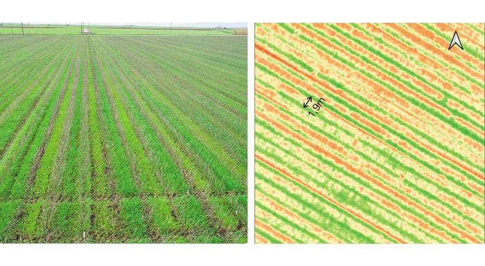Σιτάρι έπειτα από βαμβάκι. Διακρίνονται ζώνες με βαθύ πράσινο χρώμα και ζώνες πιο ανοιχτόχρωμες. Στη δεξιά εικόνα αποτυπώνεται ο δείκτης βλάστησης NDVI από το ίδιο χωράφι με drone. Το κόκκινο χρώμα υποδηλώνει υψηλή βλάστηση και το πράσινο χαμηλή. Οι ζώνες συμπίπτουν με τις γραμμές όπου υπήρχαν τα λάστιχα στο βαμβάκι όπου γινόταν υδρολίπανση. Η παρουσία υπολειμματικού αζώτου στο έδαφος είναι εμφανής ακόμη και οκτώ μήνες μετά την εφαρμογή του.