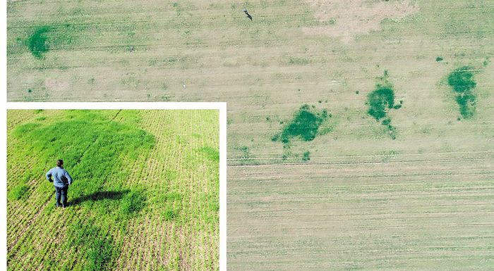 Κηλίδες υψηλής βλάστησης σε καλλιέργεια σίτου στο στάδιο του αδελφώματος που οφείλονται σε υψηλή παρουσία αζώτου. Η προηγούμενη καλλιέργεια ήταν βαμβάκι και γινόταν υδρολίπανση με στάγδην άρδευση. Οι κηλίδες συμπίπτουν με τα σημεία όπου υπήρχε διαρροή νερού από χαλασμένους σταλάκτες.