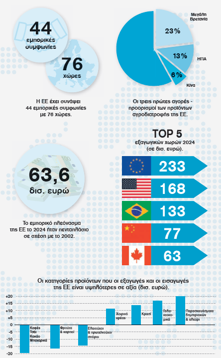 Αυτήν τη στιγμή, η ΕΕ έχει συνάψει 44 Συμφωνίες Ελεύθερων Συναλλαγών με 76 χώρες σε όλο τον κόσμο. Πριν από έναν μήνα, «έκλεισε» η συμφωνία με την Ινδονησία, τη μεγαλύτερη μουσουλμανική αγορά του κόσμου. Σε διαπραγματεύσεις βρίσκεται η ΕΕ με τις χώρες της Mercosur (συμφωνία 1.000 σελίδων στην τελική φάση ολοκλήρωσης), την Ουκρανία, την Ινδία, την Ταϊλάνδη, τη Μαλαισία και τις Φιλιππίνες. Σε εξέλιξη βρίσκεται και η διαπραγμάτευση με τις ΗΠΑ, αλλά με αμφίβολο αποτέλεσμα. Τέλος, προς ολοκλήρωση βαίνουν οι συζητήσεις για αναβάθμιση και ανανέωση της εμπορικής συμφωνίας με το Μεξικό.