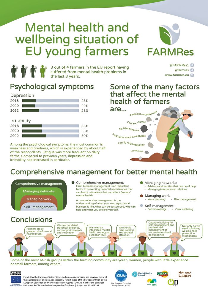 Το FARMRes (Farmers Assistance Resources for Mental Resilience) είναι ένα έργο στο πλαίσιο του ευρωπαϊκού προγράμματος Erasmus+, με στόχο την ευαισθητοποίηση και την ενδυνάμωση των αγροτών να αντιμετωπίσουν ζητήματα ψυχικής υγείας. Υπό τον συντονισμό του Ευρωπαϊκού Συμβουλίου Νέων Αγροτών (CEJA), το FARMRes θα παρέχει μια πλατφόρμα εκπαίδευσης για τους αγρότες για την πρόληψη και την παροχή πρώτων βοηθειών.