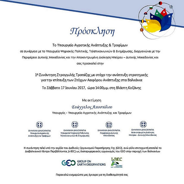 Συγκεκριμένα, το Υπουργείο Αγροτικής Ανάπτυξης & Τροφίμων σε συνέργεια με τo Υπουργείο Ψηφιακής Πολιτικής, Τηλεπικοινωνιών & Ενημέρωσης διοργανώνουν με την Περιφέρεια Δυτικής Μακεδονίας και την Αποκεντρωμένη Διοίκηση Ηπείρου – Δυτικής Μακεδονίας την 1η Συνάντηση Στρογγυλής Τραπέζης, στη Βλάστη Κοζάνης, με στόχο την ανάπτυξη στρατηγικής για την επίτευξη των Στόχων Αειφόρου Ανάπτυξης στα Βαλκάνια. Η συνάντηση τελεί υπό την αιγίδα του Διεθνούς Οργανισμού Παρατήρησης Γης (GEO), ενώ ρόλο επιταχυντή επιτελεί το Διαβαλκανικό Κέντρο Περιβάλλοντος ως διαπεριφερειακός οργανισμός του GEO στην περιοχή των Βαλκανίων. Η παράλληλη συμμετοχή διεθνών οργανισμών που δραστηριοποιούνται γύρω από τον κλάδο της Παρατήρησης της Γης καθώς και μιας κρίσιμης μάζας φορέων λήψης απόφασης εγγυάται τον καλύτερο συντονισμό των κρατών και θέτει τις βάσεις για μελλοντική ενίσχυση της οικονομίας των εμπλεκομένων χωρών μέσω της δημιουργίας πολλαπλών δραστηριοτήτων σε αναδυόμενους τομείς της επιχειρηματικότητας.