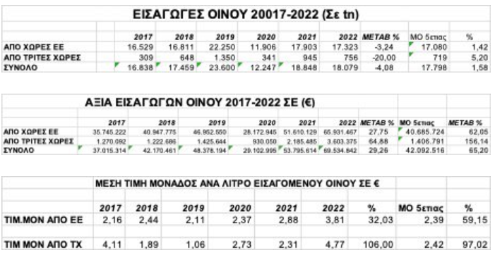 Μείωση καταγράφουν οι εισαγωγές οίνου το 2022 σε σύγκριση με το 2021 σε ποσότητα, αλλά σημαντική αύξηση σε αξία. Ωστόσο αυξημένες καταγράφονται οι εισαγωγές οίνων συγκρινόμενες με το 2019 (προ πανδημίας έτος) ως προς την αξία κατά 43,73% και σε ποσότητες εμφανίζονται αυξημένες επίσης κατά 3,55%.