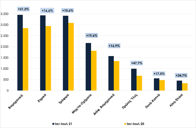 Σε κλαδικό επίπεδο, σημαντική αύξηση κατέγραψαν όλοι οι επιμέρους κλάδοι στο α’ επτάμηνο του 2021 συγκριτικά με το αντίστοιχο διάστημα του 2020. Πιο αναλυτικά, αύξηση κατέγραψαν τα βιομηχανικά (€605,7 εκατ., δηλαδή 21,2%), τα χημικά (€487,6 εκατ., δηλαδή 16,6%), τα τρόφιμα (€327,7 εκατ., δηλαδή 10,6%), τα μηχανήματα-οχήματα (€356,8 εκατ., δηλαδή 19,6%), τα διάφορα βιομηχανικά προϊόντα (€228,1 εκατ., δηλαδή 16,9%), οι πρώτες ύλες (€322,4 εκατ., δηλαδή 47,7%), τα ποτά και καπνά (€83,5 εκατ., δηλαδή 17,5%), τα λίπη και έλαια (€116,9 εκατ., δηλαδή 34,7%) και τα μη ταξινομημένα προϊόντα (€15,2 εκατ., δηλαδή 5,5%).