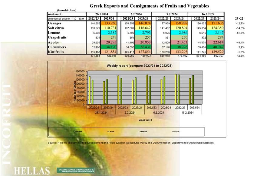 Οι εξαγωγές ακτινιδίων από 1/9/2023 έως και 16/2/2024 ανέρχονται σε 139.529 τόνους -1,6% έναντι 141.775 τ. το αντίστοιχο διάστημα 2022/23 με τις ποσότητες προς Καναδά 5.72 τ. έναντι 4.704 τ., ΗΠΑ 13.011 τ. έναντι 10.959 τ., Ισπανία 22.241 τ. έναντι 21.481 τ. και Ιταλία 22.561 έναντι 15.704 τ. συμπεριλαμβανομένων και φορτίων για βιομηχανική χρήση (προς Ιταλία, κ.α. σε άλλους προορισμούς), Εντύπωση προκαλεί η συνέχιση εισαγωγής ακτινιδίων και την ανασκοπούμενη εβδομάδα ήτοι 1/9/23-16/2/24 να έχουν εισαχθεί 1.921 τόνοι εκ των οποίων 1.158 τόνοι σε Πέλλα ήτοι 623 τ. προέλευσης Ιράν και 621 τ. Τουρκίας (προέλευσης Ιραν;)