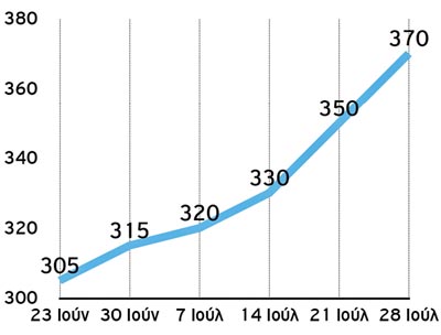 Τέλος, στο Χρηματιστήριο Εμπορευμάτων του Σικάγο, οι τιμές για τα τριμηνιαία συμβόλαια έφτασαν την Τετάρτη 27 Ιουλίου τις 1.105 μονάδες, καταγράφοντας άνοδο 30 μονάδων σε σύγκριση με μία εβδομάδα νωρίτερα.