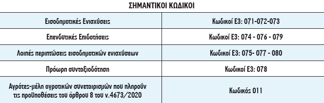 Ομοίως, σε νέα περίπτωση του κωδικού 657-658 (του εντύπου Ε1) μεταφέρεται και ο κωδικός 083, ο οποίος έχει να κάνει με τις ενισχύσεις που καταβάλλονται από τον ΟΠΕΚΕΠΕ: α) Σε επιχειρήσεις κτηνοτροφικών εκμεταλλεύσεων, άρθρο 61 του ν. 4919/2022 – Α’ 71, β) για οικονομική ενδυνάμωση της κτηνοτροφικής παραγωγής στον νησιωτικό χώρο, άρθρο 113 του ν. 4926/2022 – A’ 82 και γ) λόγω της ενεργειακής κρίσης και της αύξησης του κόστους των λιπασμάτων, άρθρο 95 του ν. 4982/2022 – Α’ 195).