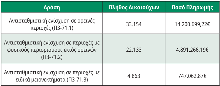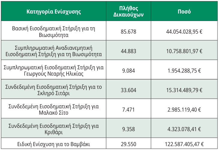 Το συνολικό ποσό των πιστώσεων ανέρχεται σε 19.839.028,28 ευρώ σε 56.969 μοναδικούς δικαιούχους για το έτος ενίσχυσης 2025. Η ανάλυση της πληρωμής ανά δράση έχει ως εξής: