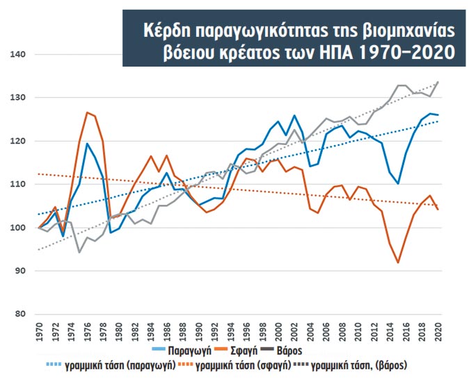 Αυτό οφείλεται, όπως καταγράφουν, στην ανάπτυξη και στην υιοθέτηση τεχνολογιών που βελτιώνουν την αποτελεσματικότητα της παραγωγής βοοειδών.